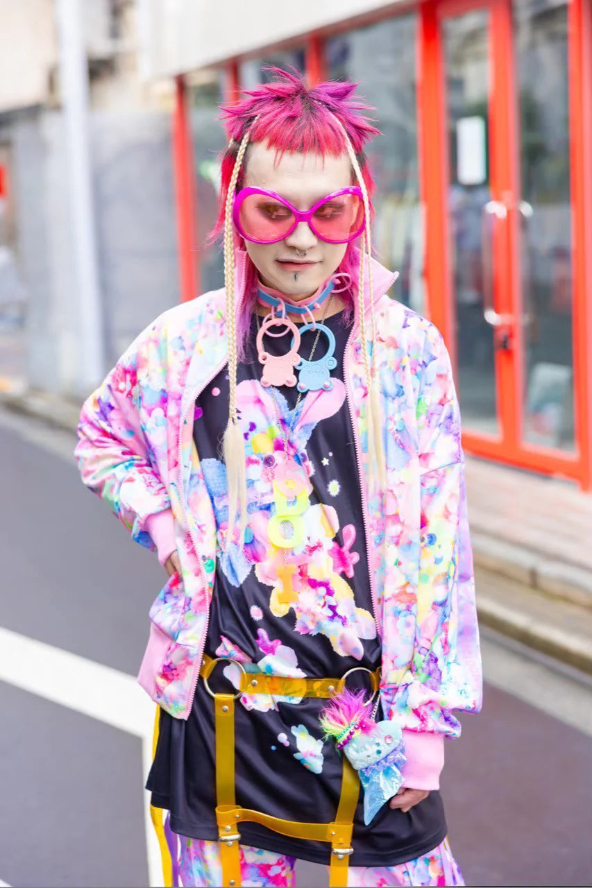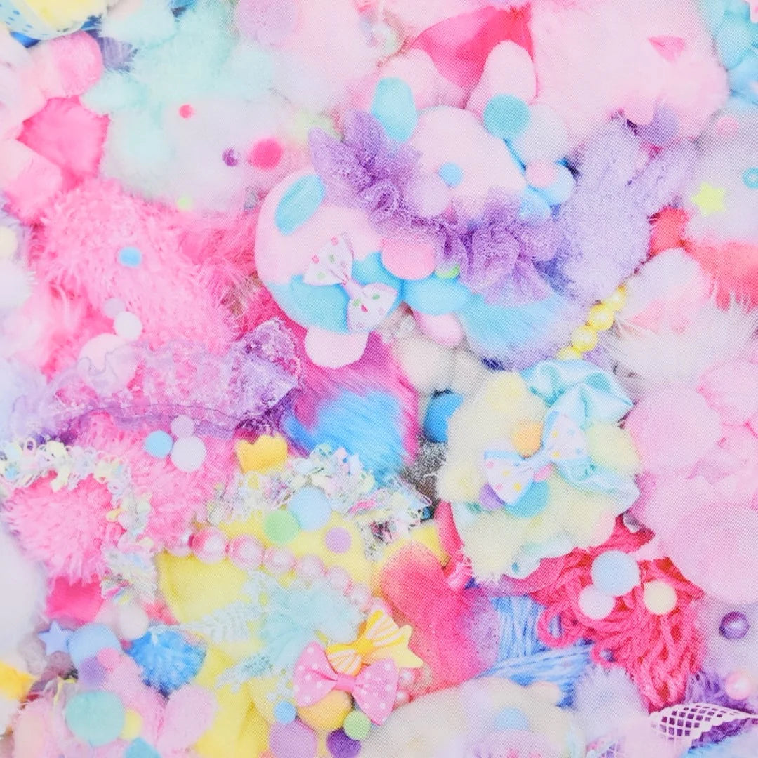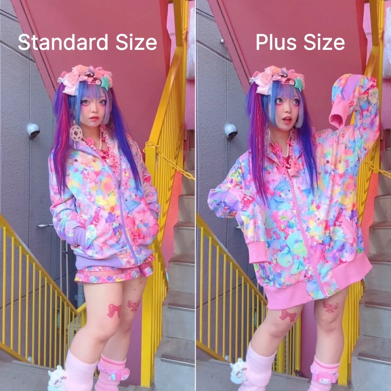 Kawaii pastel pink zip-up track jacket by 6%DOKIDOKI, part of the brand's 30th anniversary "KAWAIITOPIA" collection. Features a colourful, all-over pastel plushie print. Perfect for fans of Harajuku styles like decora and fairy kei! Available in both standard and plus size.